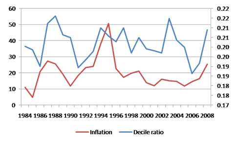 This graph depicts the rate of inflation and the ratio of mean per capita expenditures of the second poorest to the second richest decile (the same as the ratio of the shares of decile 2 to 9). I did not choose the first and the tenth deciles because survey data are less reliable at the two extremes.