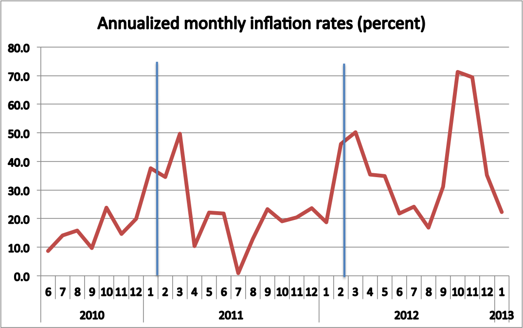 3. “The latest data, for the month ending December 20, 2012, indicate that inflation has decreased substantially — down to 2.5% per month from 4.5%.”