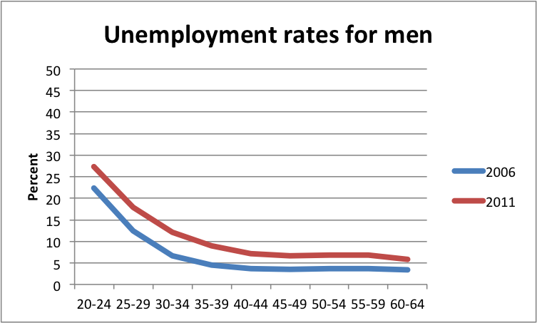 Rising youth unemployment is not very surprising because the revolution baby boomers have been entering the labor market at rates 4-5 times the rate older workers retire.  What is new and shocking is the increase in unemployment of older workers.  This increase is obviously bad for older workers, but it is especially bad for younger workers.  Consider male workers aged 25-29 in 2006, many of whom waited several years to get a job.  In the past, the wait would be rewarded by a job as they entered the low unemployment ages of 30+.  But not for this group, because by 2011 when they reached their early 30s, the unemployment rate for men 30-34 years old had jumped from 6.6% to 8.9%. If you include discouraged workers the picture worsens still.  This means that for young men hope as well as their actual condition declined in 2006-2011.
