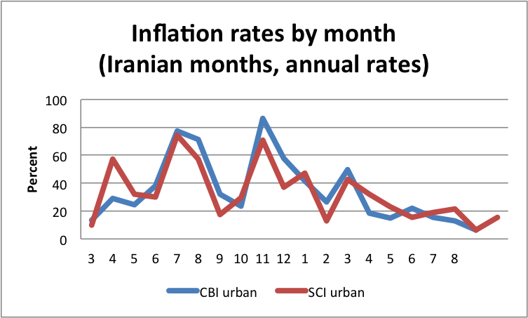 Two questions arise. First, if inflation has been below 20% for the last six months, why does the Rouhani budget for the next Iranian year (beginning 21 March 2014) predict it to be 25% for that year? Does the government expect to run a bigger deficit next year than it is currently running? Is it hedging against a breakdown of the Geneva talks? The second question is why does it use the point-to-point and 12-month average rates of inflation, which are still over 30%, when its own price-reporting agencies (the CBI and SCI) provide it with the actual rates every month? Is it exaggerating inflation to keep the public behind its extreme austerity budgets?