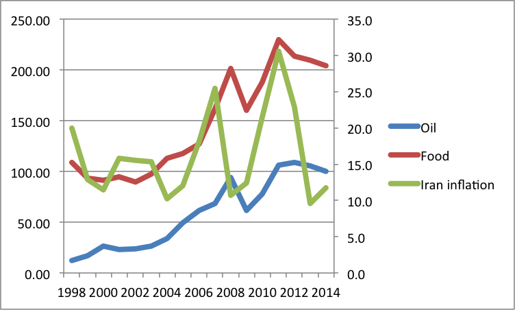 Two important sources of inflation in Iran are the price of oil and food.  But for different reasons.  The influence of international food prices is obvious, because Iran is a major importer of foodstuffs.  But how oil causes inflation in Iran is less obvious because it is an export commodity.  The way the latter mechanism works is that expenditure of oil revenues causes not-traceable prices in Iran to rise.  This is the so-called real appreciation that requires the relative price of non-tradable to tradable goods to increase.  Of course, this can occur if prices are fully flexible, but that is a fairy tale people tell when they want to blame everything on the growth of money supply. The truth is that money supply has to grow to accommodate the change in relative prices through differential increase in the price of tradable and non-tradable goods.