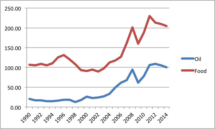 Note: Food price is the FAO index, and oil is in USD per barrel.