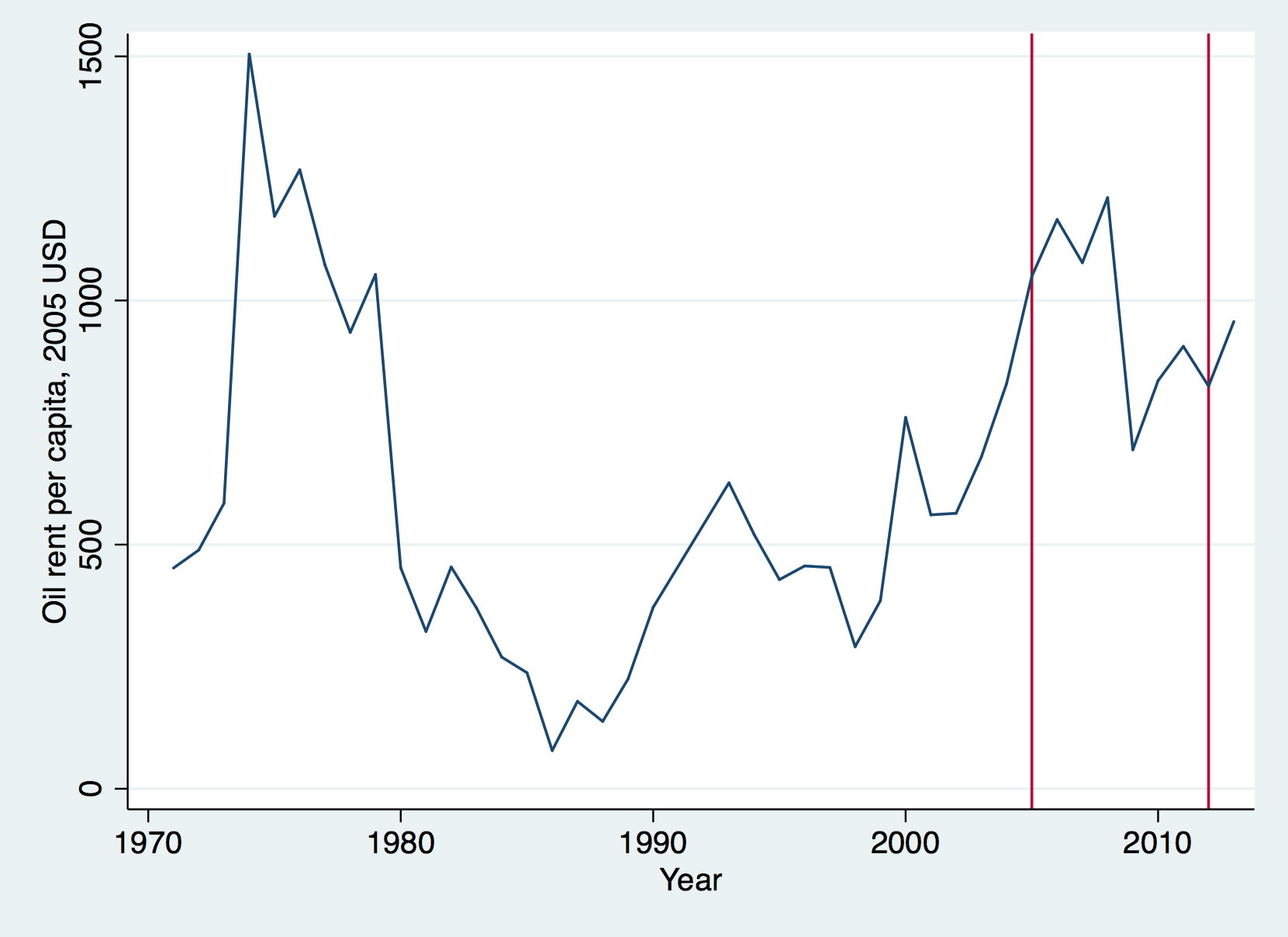 I also reproduce Figures 1 and 3 in terms of oil rents published by the World Bank, which look very similar to the above: