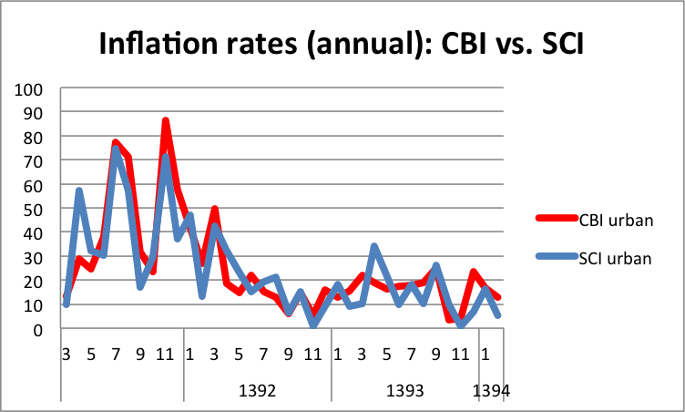 Two of the many economic indicators that SCI publishes, on inflation and unemployment, are closely watched by the public and are therefore politically consequential. But, at least for inflation, the two agencies have been telling the same story, so there is no reason — other than saving on costs — to restrict their production to one agency only. As the graphs below show, the Consumer Price Index series for urban areas published by SCI and CBI show remarkable similarity. The graph on the left shows the urban CPI series from both institutions, which follow each other rather closely, although CBI shows faster inflation since 1390. If you are interested in how inflation is reported each month, in some months the two indexes can differ (see graph on right). For example, a year ago, in July 2014, SCI had the rate of inflation going up while CBI had it coming down. But most of the time there is no discernible difference