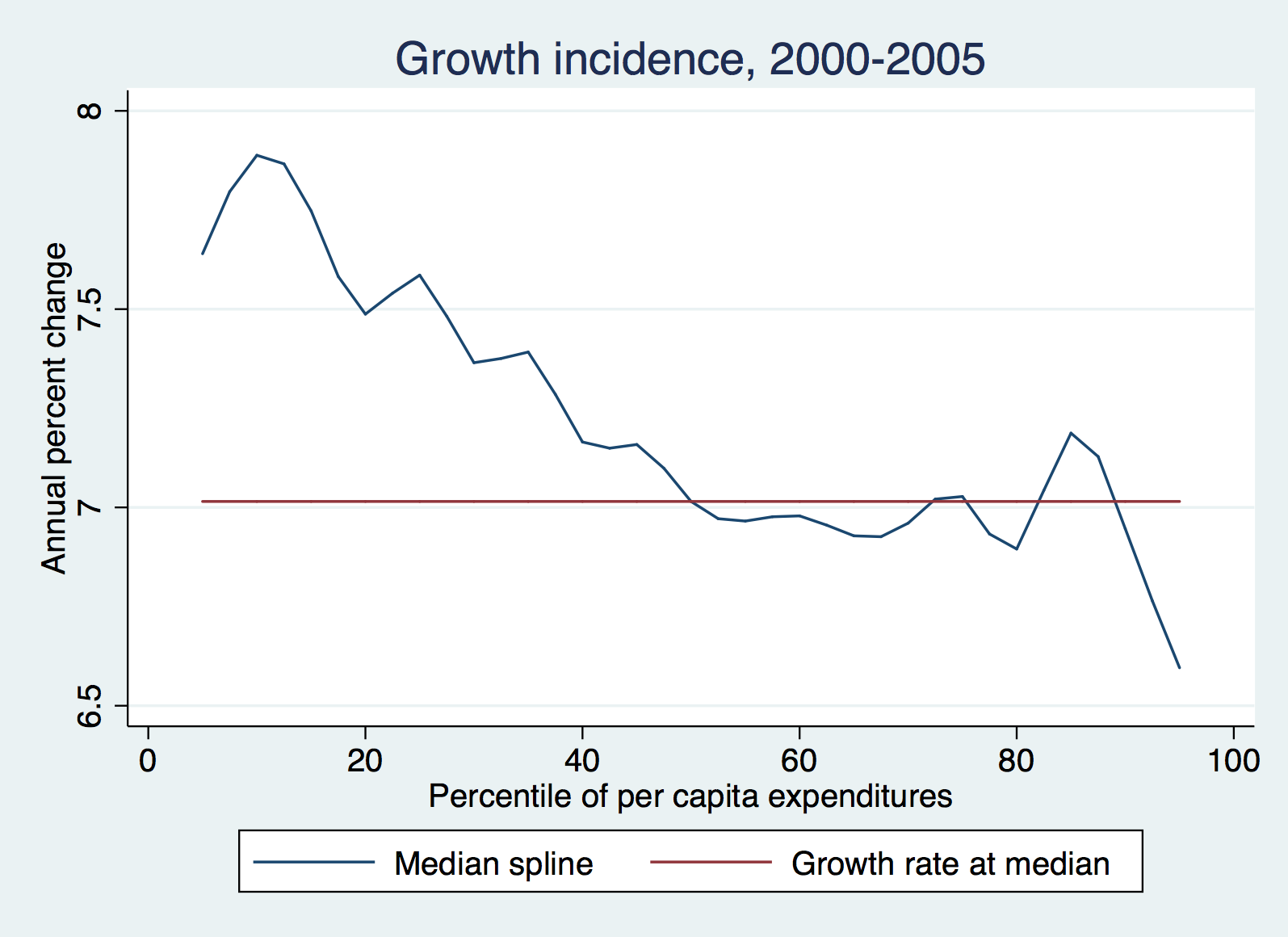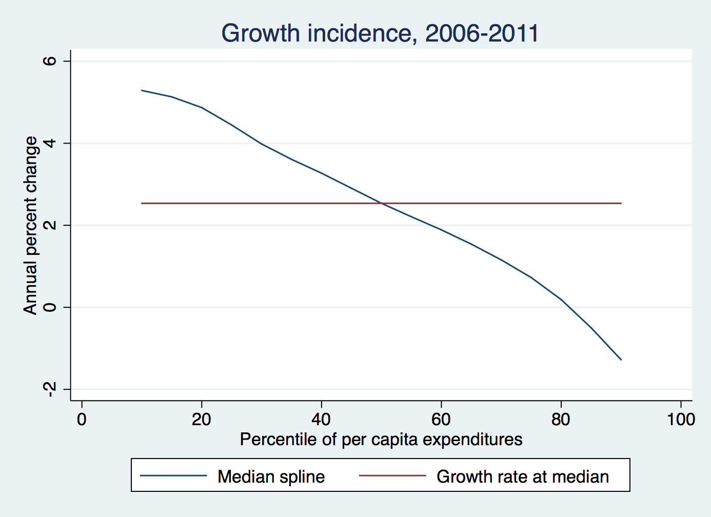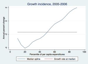 The questions is, then, whether this growth is visible in the expenditures of ordinary Iranians, and how it breaks down by income group.  A neat little graphic tool called growth incidence curves (GIC), will help us answer these questions.  The GICs I show here plot the growth rate of per capita expenditures (pce) by quintiles of pce.  (For a more information on GICs, see Ferreira et al).  They offer a simple visual regarding the inclusivity of economic growth.  If the curve is downward sloping, the pce of poor deciles has grown faster than the rich, and growth has been pro-poor; the opposite if upward sloping.