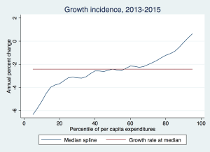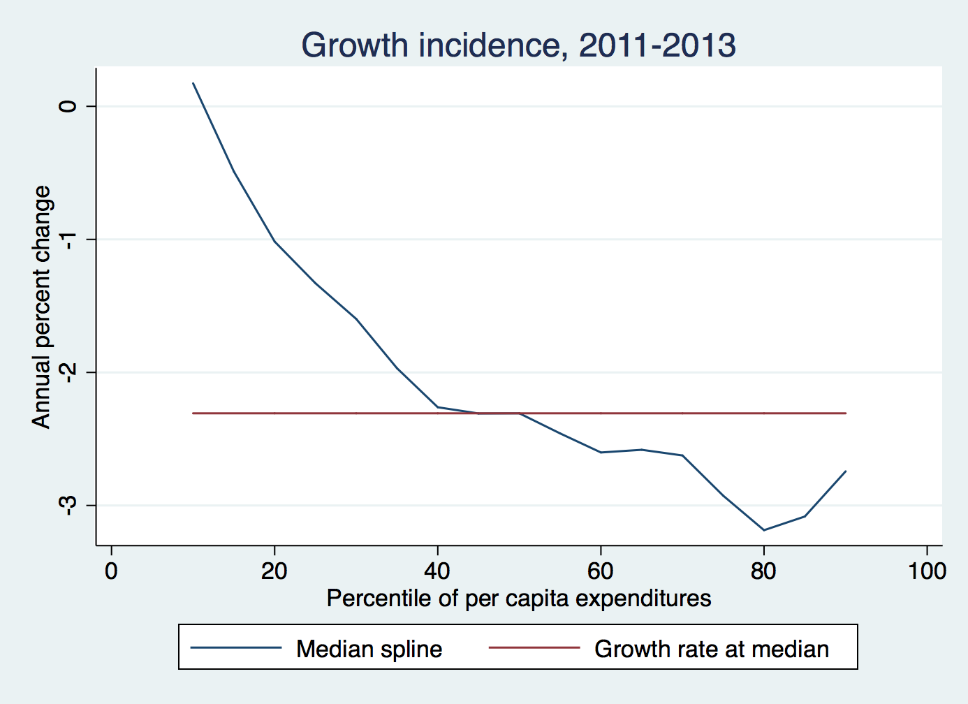 As the economy entered into negative growth — the sanctions induced recession — the GIC remained downward sloping.  I believe the cash transfer program that Ahmadinejad started in 2011 was most effective in protecting the poor during the downturn that covered the remainder of his term, 2011-2013.  The recession brought the median pce by 2.4 percent per year, and reduced pce for all deciles except the very poorest.