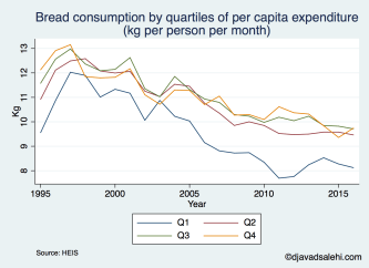 The decline in consumption of bread, from about 10.9 kg per person per month to 8.1 kg, is not necessarily a sign of deprivation. It is a good thing, in my view, that Iranians have reduced their bread consumption closer to the global average and the same as in Turkey.