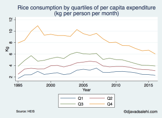 But if you find poverty rate calculations too subjective, you may find data on food consumption (by weight) more convincing. The graphs below show consumption of meat, chicken, bread and rice per kilogram per person using survey data collected by the Statistical Center of Iran and made available in unit record online, so if you wish you can replicate them. The graphs divide the population into groups by quartile of income. So Q1 includes the poorest 25 percent of the population, Q2 the lower middle class, and so on.