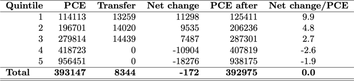 Notes: Quintiles of per capita expenditures; “PCE” is pce in 2018 inflated by the CPI; “Transfer is the average cash transfer for the quintile; “Net change is the difference between transfers and additional gasoline expenditures; “PCE after” is PCE plus the net change; and the last column is the ratio net change to PCE.