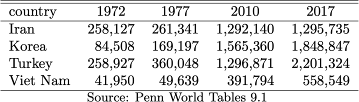 And here are the numbers from the Penn World Tables, version 9.1, which use Purchasing Power Parity GDP values in millions USD (Comparable World Bank WDI data do not go back to 1977).