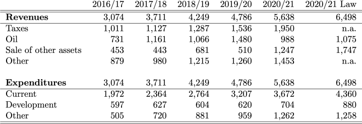 I list below three tables that include the budget bill for 2020/2021 and as it went into law. Table 1 is the actual nominal numbers, Table 2 shows the real values, and Table 3 presents their share in the budget. The main change in 2020/21 compared to the recent past is the sharp decline in oil revenues (share down from 30 to 17 percent) and increase Islamic bonds (up by more than three-fold), which is borrowing from the public (or the banks if the public is not willing to borrow) as I discuss this in my Foreign Affairs article.