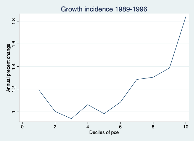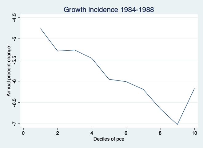 The GIC for the period 1984-1988 shows that, as one would imagine, on the whole the war economy favored the poorer households. Living standards declined for all groups, but generally less so for the poorer deciles of per capita expenditures.