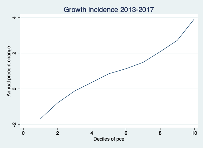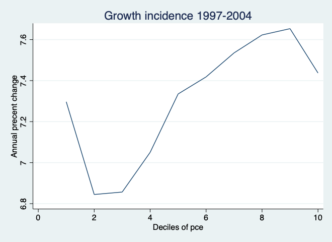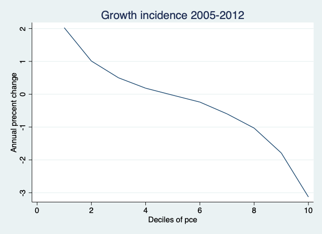 I try to answer this question in this post using a simple graphic tool, the Growth Incidence Curve (GIC), pioneered by Ravallion and Chen (2003). The GIC depicts average growth rate for each decile for a specified period of time. The graphs used here use the micro data files of Iran’s Expenditure and Income Surveys, available at the site of the Statistical Center of Iran (SCI).
