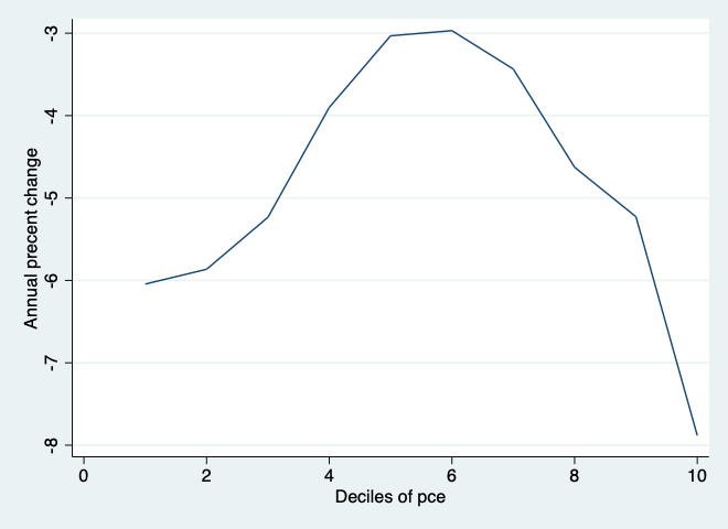 The next two years, after Trump, saw the complete unraveling of Rouhani’s economic plans for Iran (Figure 5B). Trump imposed his maximum pressure sanctions in May 2018, which reduced Iran’s oil exports to a trickle and froze 90% of all the reserves Iran had abroad ($122.5 billion in 2018, according to the IMF). Growth took a dive, from +7% to -6%. The impact of this reversal on ordinary people’s living standard, as I have documented elsewhere, was dramatic. In Figure 6, we notice an inverted U-shaped pattern: while all deciles lose, the dropping income for the 20% at the bottom and the greater. The greater loss at the top is not surprising. Downturns usually reduce the share of the rich, perhaps because their incomes are closely tied to the fortunes of the government and the oil rent, which fall first during downturns.