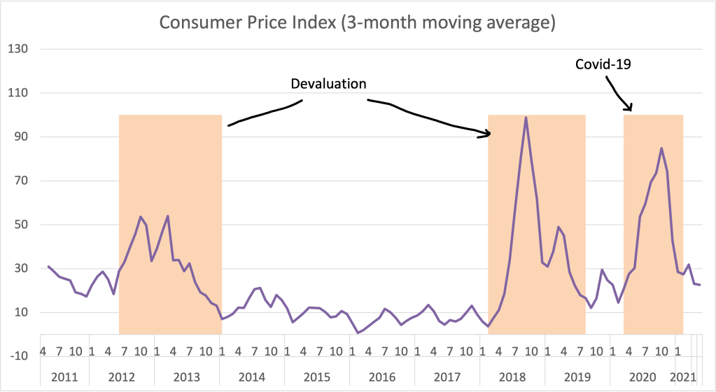 Before getting into how the macro shocks affected inflation, one thing is already clear: this level of close correspondence between the timing of the external shocks (two episodes of sanctions in 2012 and 2018, followed by Covid in 2020) and inflation cannot be explained by independent changes in the fiscal position of the government. Rather these shocks caused the budget deficit to deteriorate, which caused liquidity to expand.