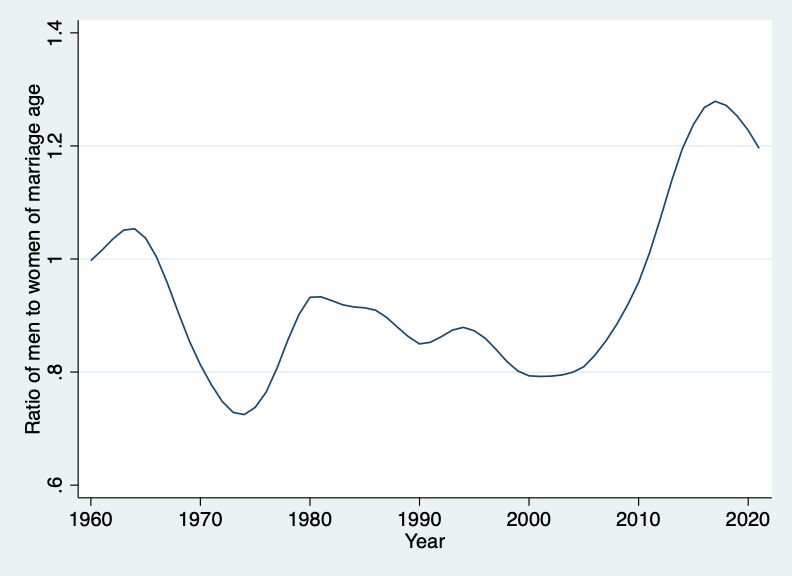 Figure 4. Marriage market imbalance. The ratio of men 25-29 to women 24-25.