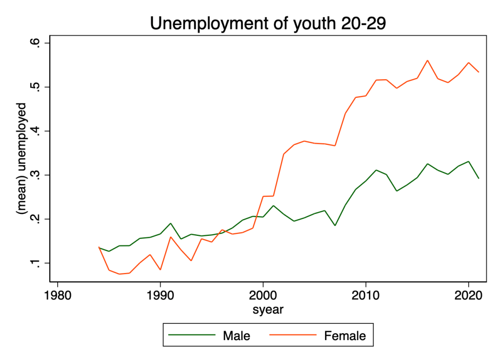 But the improvement in education has not increased their chances in employment. Youth unemployment rates have been rising and are now several times the rate for older age groups. Fig. 1 depicts the unemployment rates for young (20-29) men and women from mid-1980s to 2021. The rates have picked up considerably since 2000, reaching in recent years around 30% for men and 50% for women. About the same time, the unemployment rates for young women exceeded those of men. I am not sure what factors explain these changes, but the rising proportion of youth in the early 2000s — the youth bulge — and sluggish economic growth under sanctions after 2010 are surely high on the list.