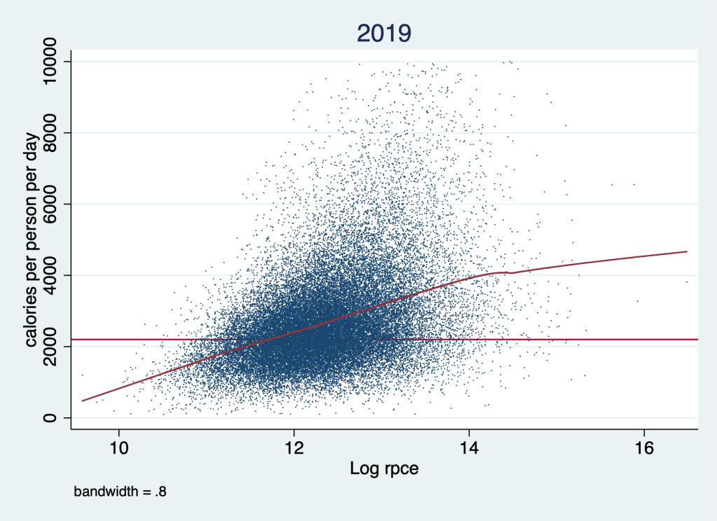 Another criticism of the Ministry’s report is that it estimates separate poverty lines for different years, a practice that introduces unnecessary errors into poverty estimates. This is because each estimate is based on an imprecise calorie calculation. Poverty lines measure the cost of living for an individual who needs 2100 calories per day. But the relation between calorie and income (or expenditures) is quite noisy, as this scatter graph for 2019 (1398) shows. The horizontal red line is the 2100 calories and the upward sloping red line is the non-parametric (lowess) estimates of the relationship between log real per capita expenditures and calories consumed. Just looking at the estimated relationship without the scatter plot creates the false impression that we know what level of expenditures is necessary to buy 2100 calories, whereas in reality there are many levels. The expenditures represented by the intersection of the two red lines, are associated with widely varying levels of calories (data from the expenditure survey of SCI, HEIS 2019).