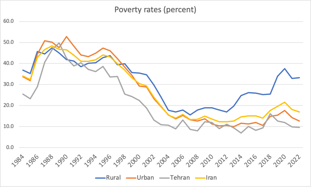Next, let’s look at how the poor have fared since 2020. To define who is poor, I use poverty lines that differ by region (rural, urban, and Tehran) but stay constant over time. It is important to allow poverty lines to differ based on the cost of living but not change over time. I update the lines calculated for 2005 to 2022 prices, the same prices in which expenditures are measured. I further adjust the lines so they average close to the $7.60 PPP per person per day used by the World Bank for upper-middle-income countries (of which Iran is a precarious member, having fallen a notch in 2019). The poverty lines are: $6.20 in rural areas, $6.80 in urban areas, and $9.39 in Tehran. The gap between Tehran and rural areas has narrowed from a factor of 2 in 2005 to 1.5 in 2022 because of higher inflation in rural areas.