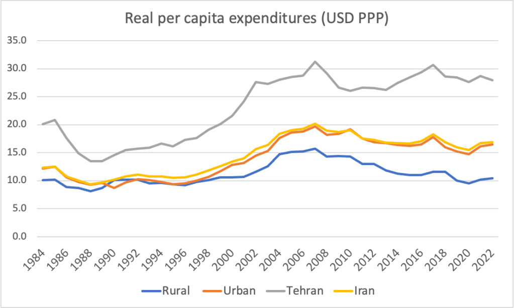 The figure below (and the corresponding data in Table 1 at the end of this post) show average real per capita expenditures, or consumption per head, in USD PPP by region of residence (rural, urban, and urban Tehran). The share of population of these regions in round numbers that are easy to remember are 25, 60, and 15 percent. To obtain the USD PPP numbers I divide rials by the PPP conversion factor for 2022 published by the World Bank (62,780 rials per USD). In this post, I am mostly interested in the last two years, but there is no harm looking at the whole series since 1984 (I will need the other years for a point I raise at the end of this blog).