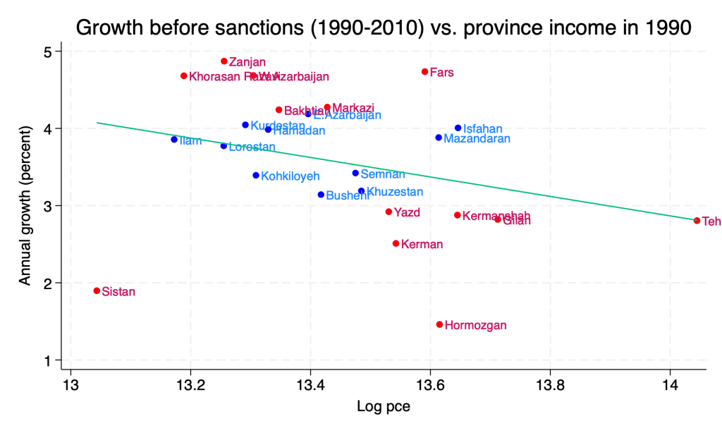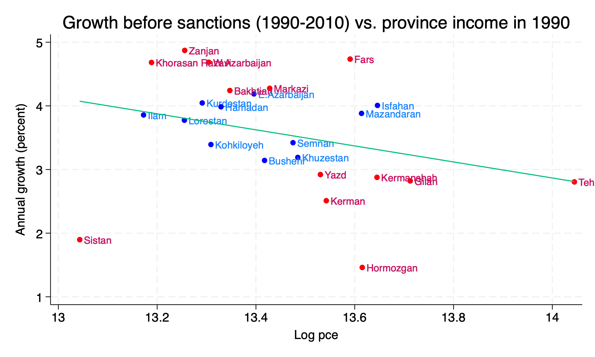 The second figure shows the same relationship for the post-sanctions period (2011–2023). All growth rates are lower, though there is considerable variation: Alborz grew by 4% per year, while Ilam shrank by -3.5% annually. The fitted line is nearly flat, indicating no clear evidence of convergence in this period. (The slope estimate is not statistically significant.)
