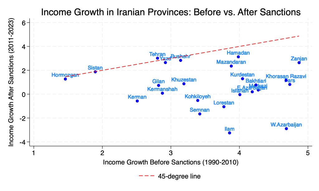 In contrast, the western provinces of Ilam and West Azerbaijan are farthest from the 45-degree line. Both performed well before sanctions, with growth rates of 3.9% and 4.9%, respectively, but suffered sharp declines after 2011 (-3.2% and -2.9%). These provinces appear to have been among the most adversely affected by sanctions.
