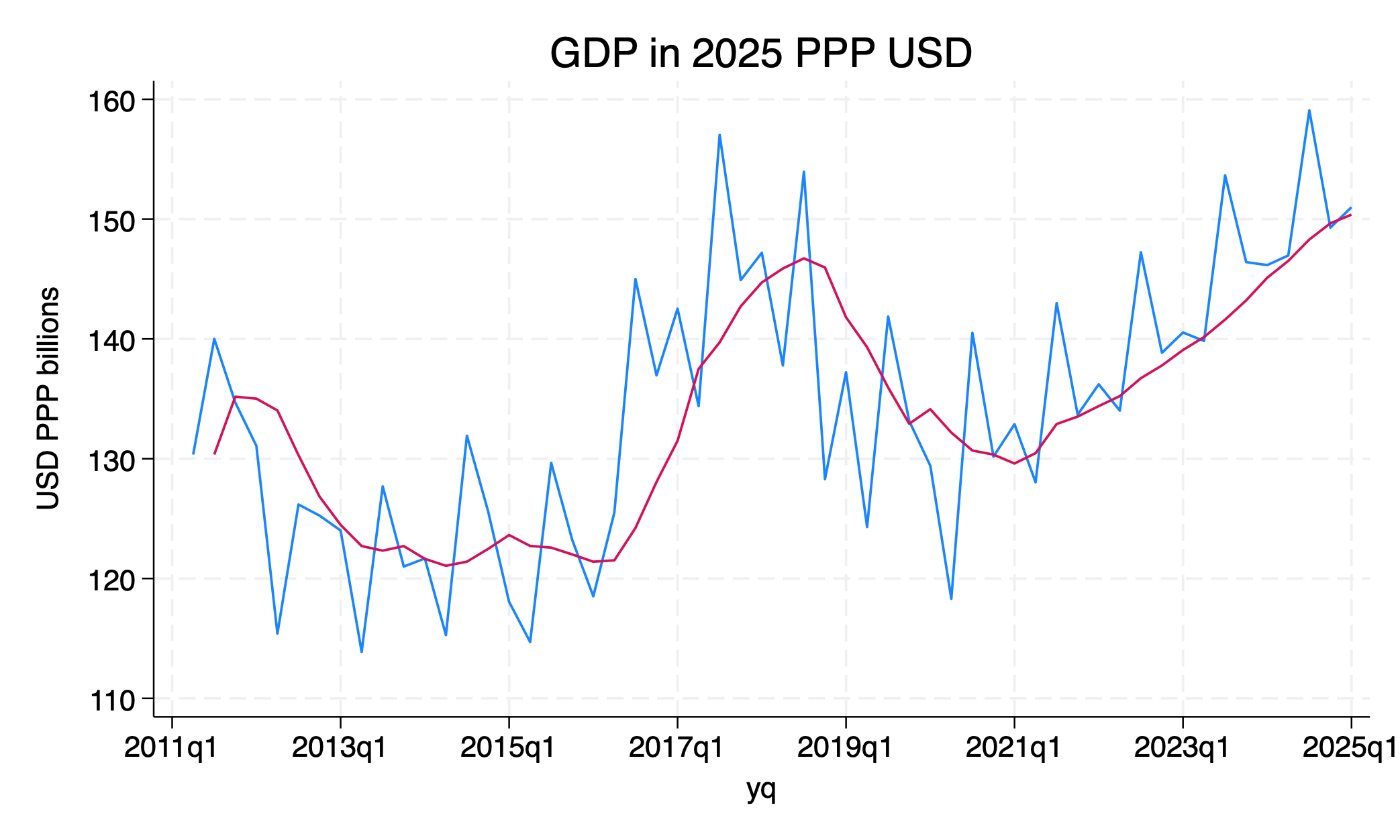 Notes: The red line is the smoothed quarterly data. Iran’s GDP is in constant 2021 rials, as reported by the Statistical Center of Iran, but displayed in PPP USD values (using the most recent rate published by the World Bank, about 90,000 rials). These figures are different from the World Bank’s own PPP series, which more accurately reflect Iran’s production relative to that of other countries but are not updated regularly and are not quarterly.