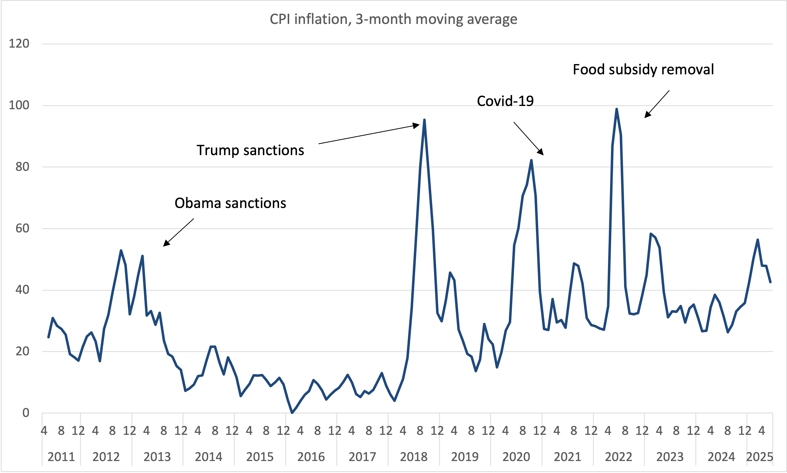 The temporary slowdown in May was closely linked to a 20% depreciation of the rial against the US dollar. This depreciation reflected Iranian optimism about the potential outcome of the latest negotiations with the Trump administration aimed at preventing war that had begun last April. Unfortunately, that optimism overestimated the power of international laws and norms of diplomatic engagement in restraining Israel and the United States: Israel started a war with Iran on June 13, two days before U.S. officials were scheduled to meet their Iranian counterparts for a crucial, last-ditch effort to avoid conflict. The US, which had backed Israel’s leap into the unknown, joined the fray ten days later by bombing Iran’s nuclear sites, all under IAEA inspection.