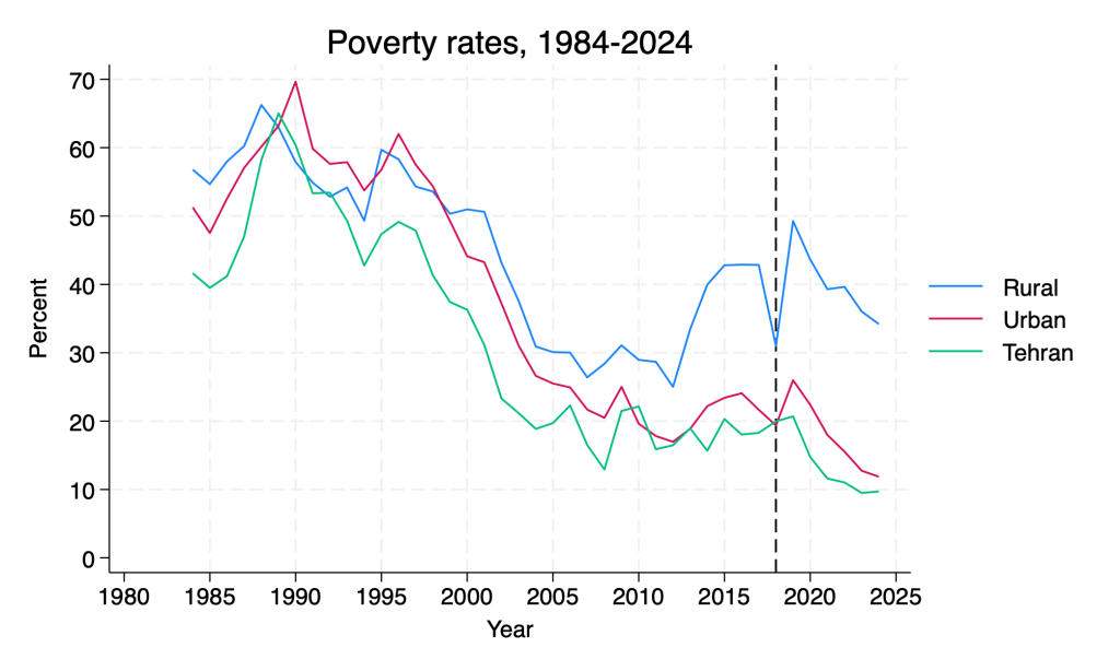 Figure 2. Poverty rates by region. The vertical line marks the 2018 US withdrawal from the Iran nuclear deal, indicating a sharp rise in poverty for the year, followed by decline since 2019.