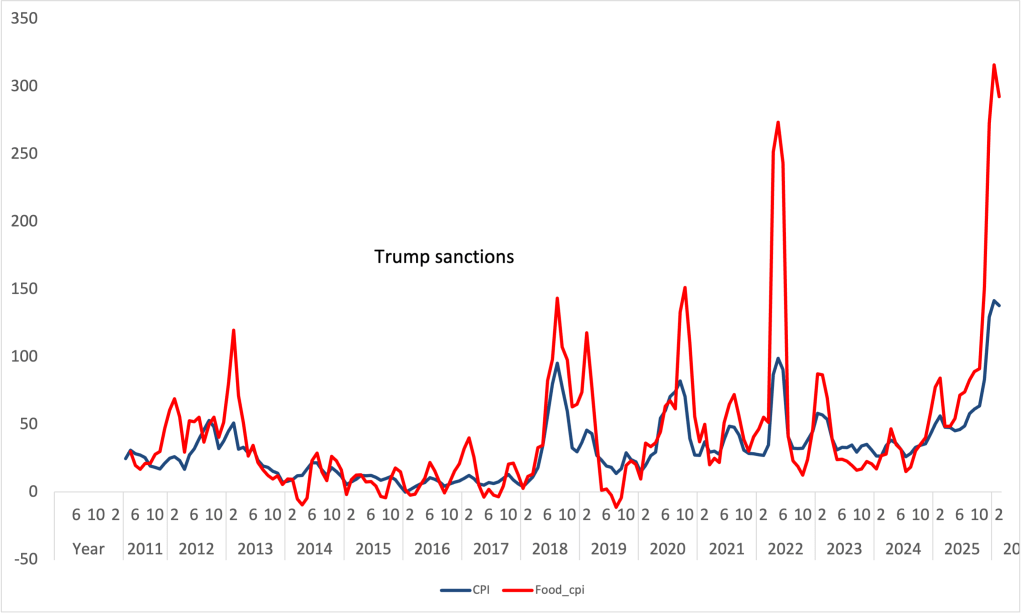 Food prices led the increase, rising roughly sevenfold over the year, compared to a 90% increase in the overall price level. This divergence is largely explained by the elimination of foreign exchange subsidies for food and medicine, as well as increased public expenditures associated with the war. When food prices outpace general inflation, poverty rises and income distribution deteriorates. The persistent surge in food prices likely compelled households to reallocate spending away from non-food items, adding to the pressure of inflation.