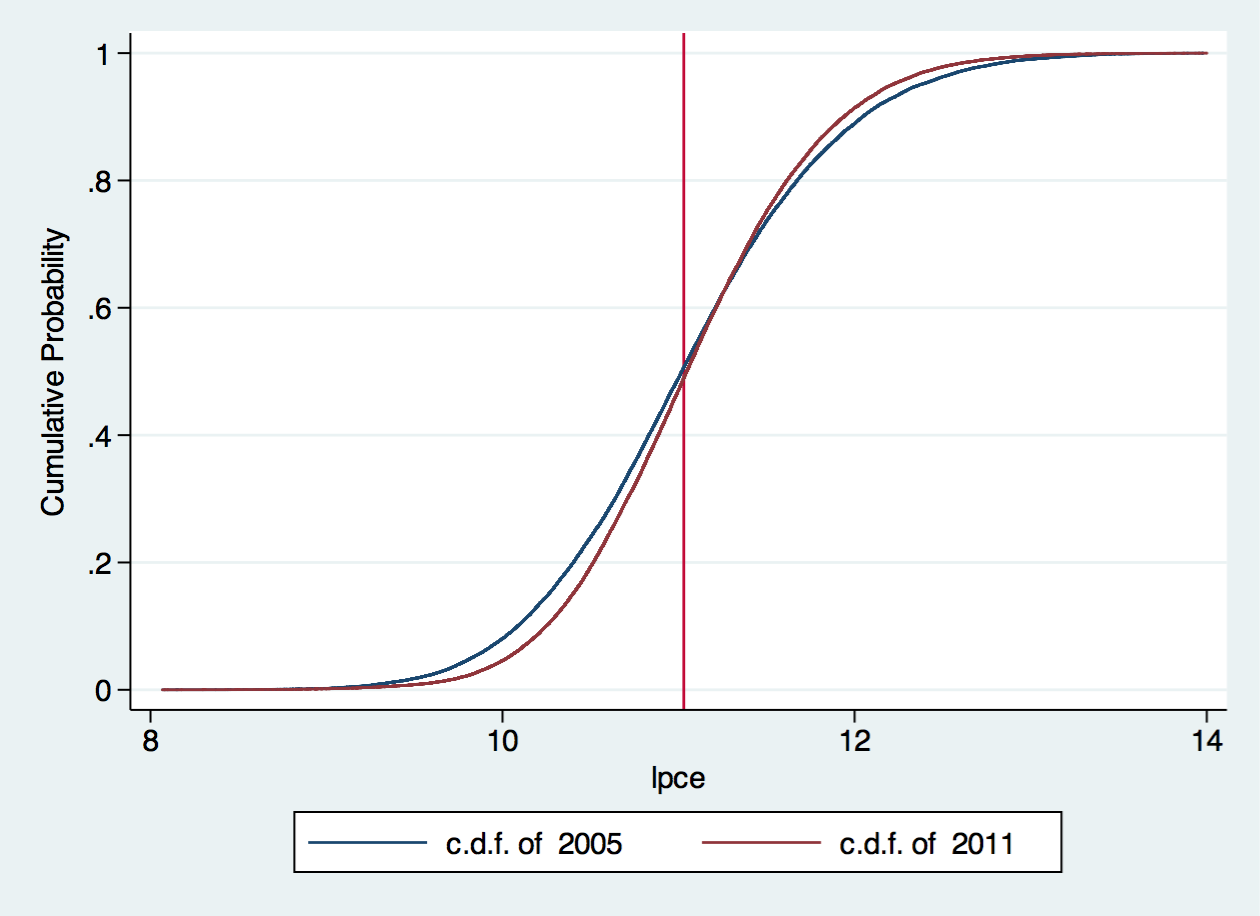 The graph of the cumulative distribution functions of the pce for 2005 and 2011 also show that if we pick a lower poverty line, one more in line with international standards, of about $4, or 22,000 rials, we we notice a larger drop in poverty, from 7.1% to 4.3%. The cdf’s also show a decline in inequality. This is most likely the result of the cash transfer program administered under the Ahmadinejad government. Whether or not this was the best way to help the poor is another matter. I have been critical of his liberal import policy that hurt the Iranian economy during these very years, but that criticism is based on the poor losing jobs, not cash. I happen to believe that giving the poor work is much superior to giving them cash, but then that is a debate for another time.